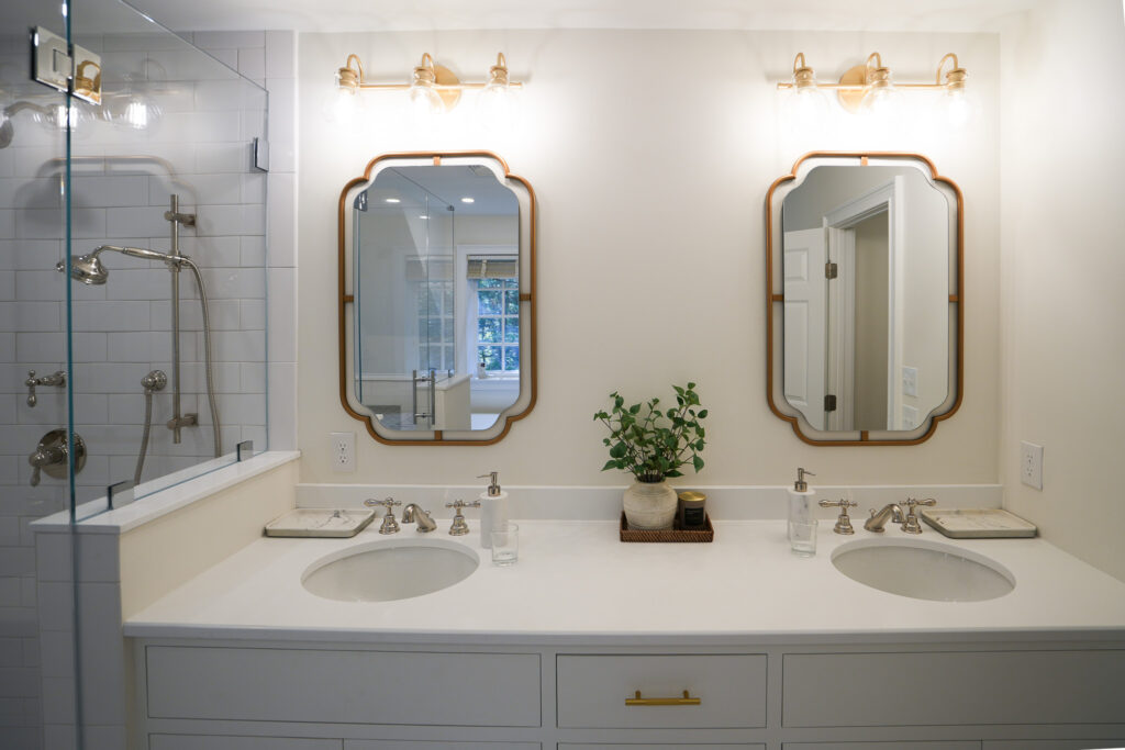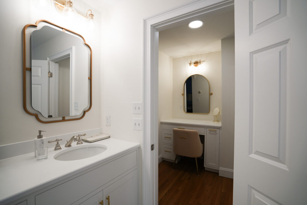 There were many unique aspects to this project, like transforming a closet nook into a seated vanity, and building two custom vanities from scratch. Let us show you what we did!
