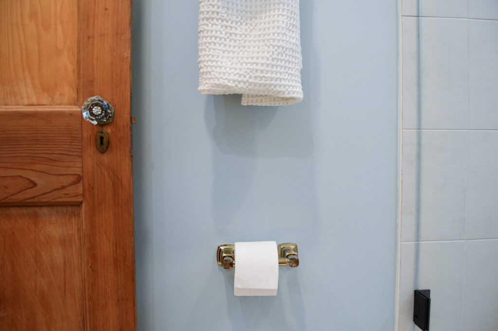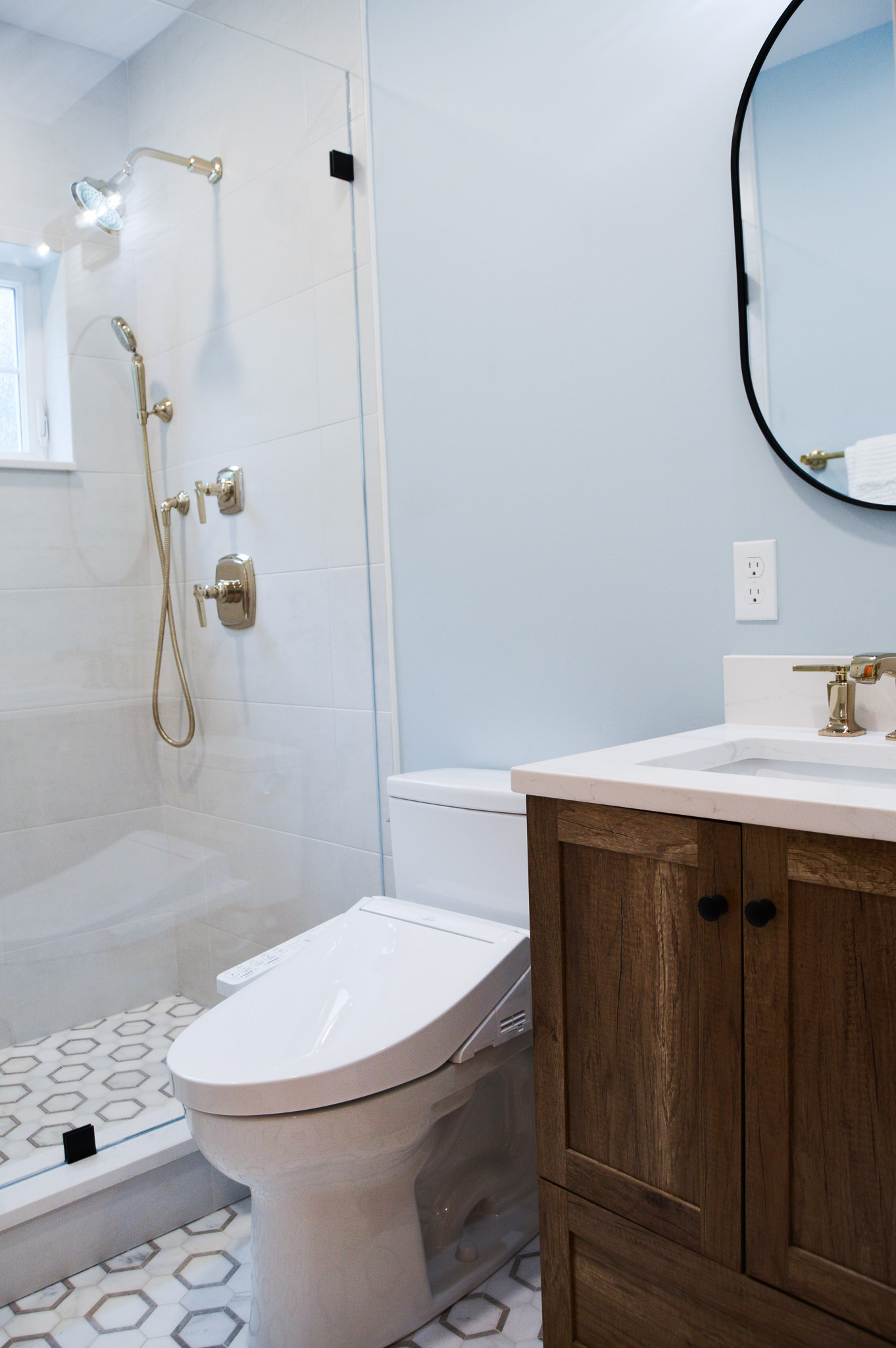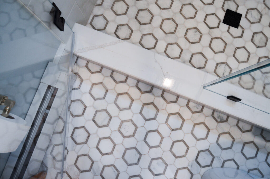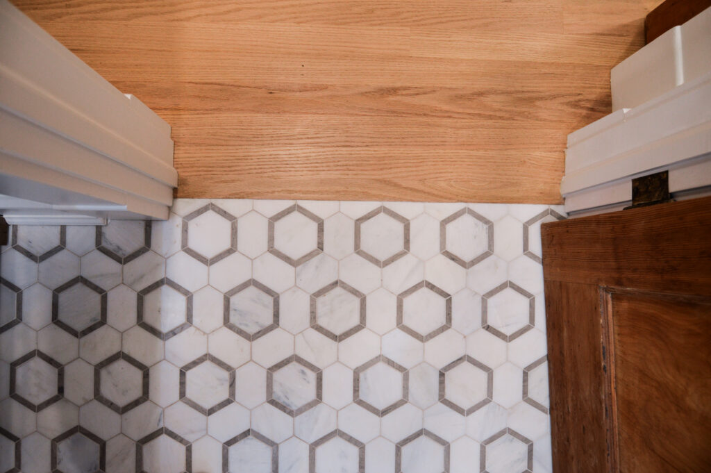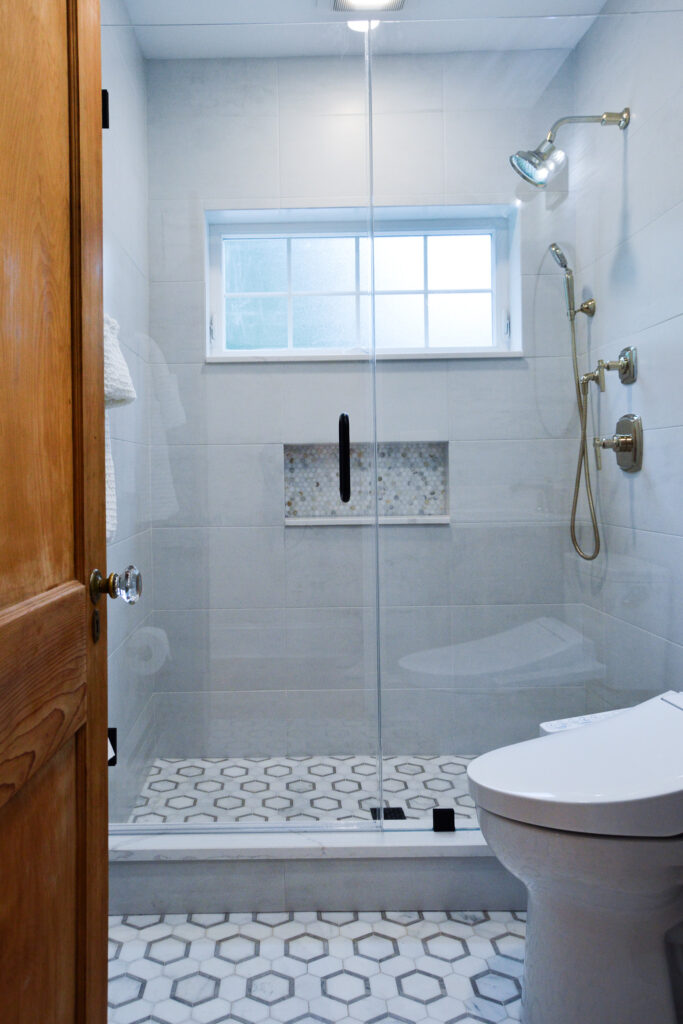 While no 1920's home would have likely had a bathroom on the first floor, and certainly not one that looked like this, we were able to build something that seemed to honor to the history of the home with gold fixtures, the original door, and all the permanence that intricate tile lends to a space.