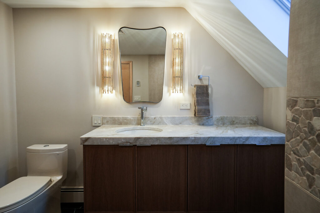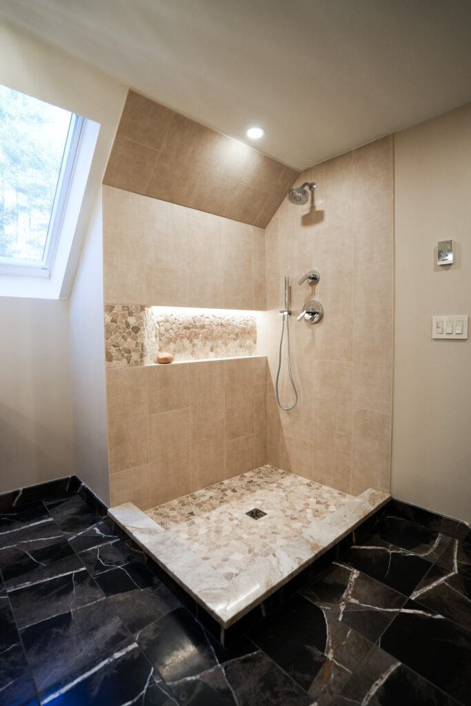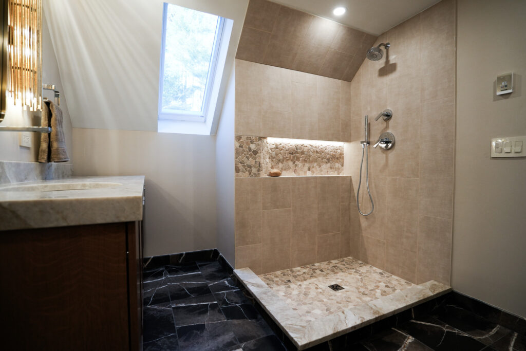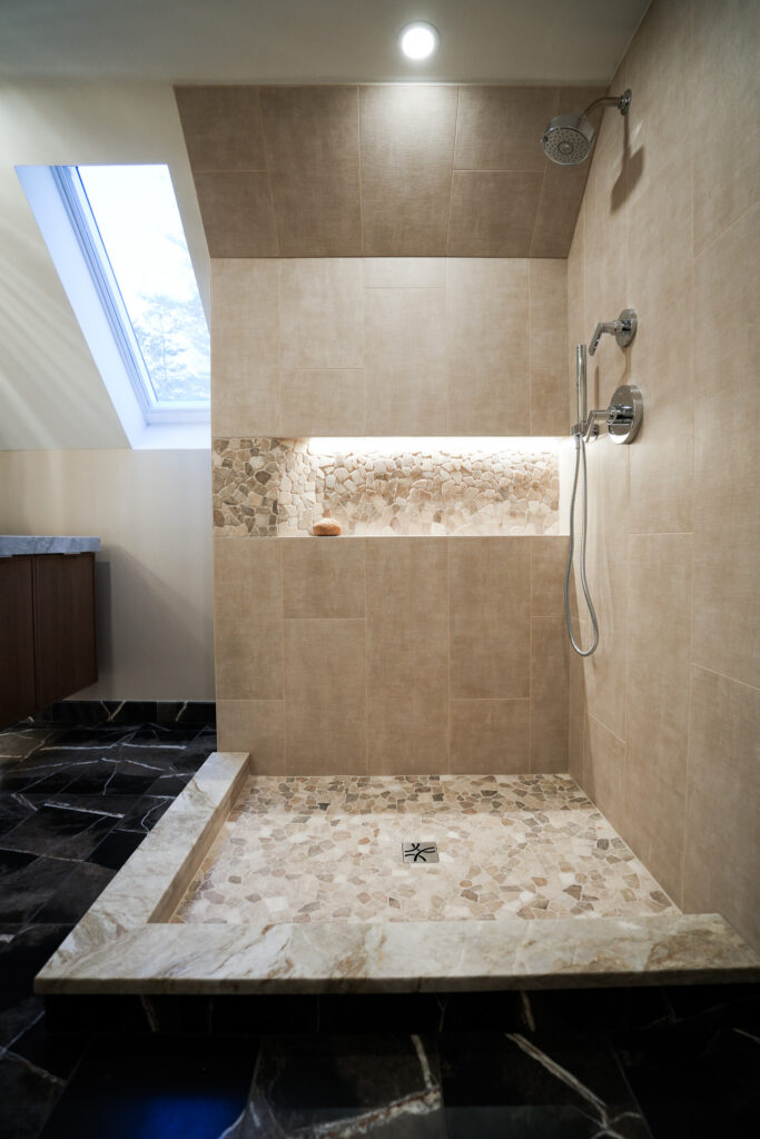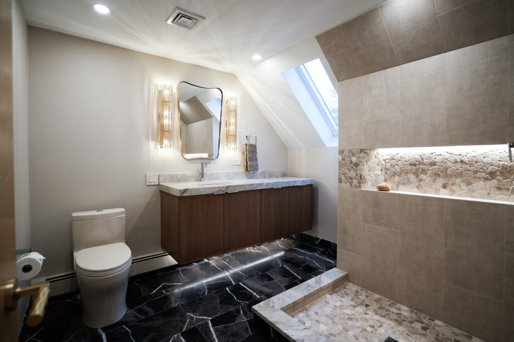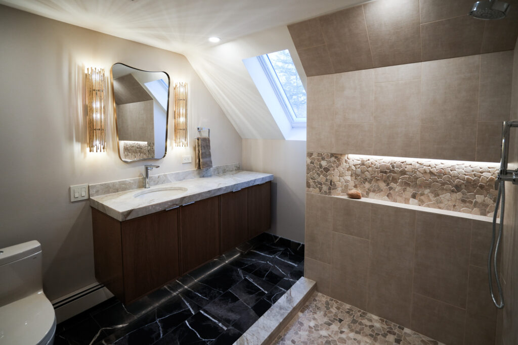 It's almost hard to believe the two spaces are the same bathroom. We were able to make the space feel much larger by reworking the layout, bumping out the exterior wall to the full extent of the crawl space and installing a skylight to bring in natural light.