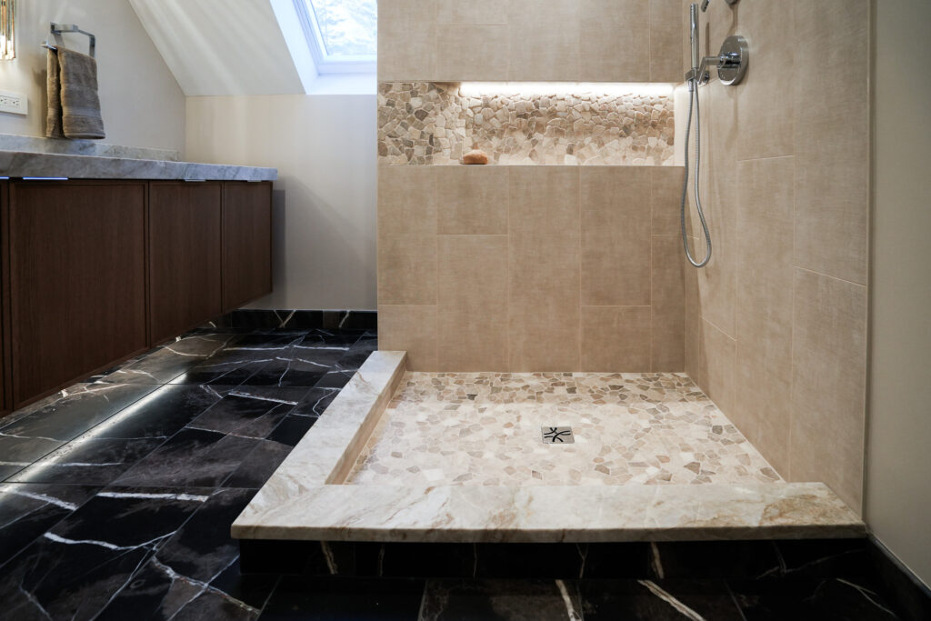 The finished result is stunning in its quiet glamor and bold simplicity. Unique features like a sloped, back-lit shower niche, an under-lit floating vanity, and understated textured tile selections make any guest of the space feel pampered and elevate their experience.