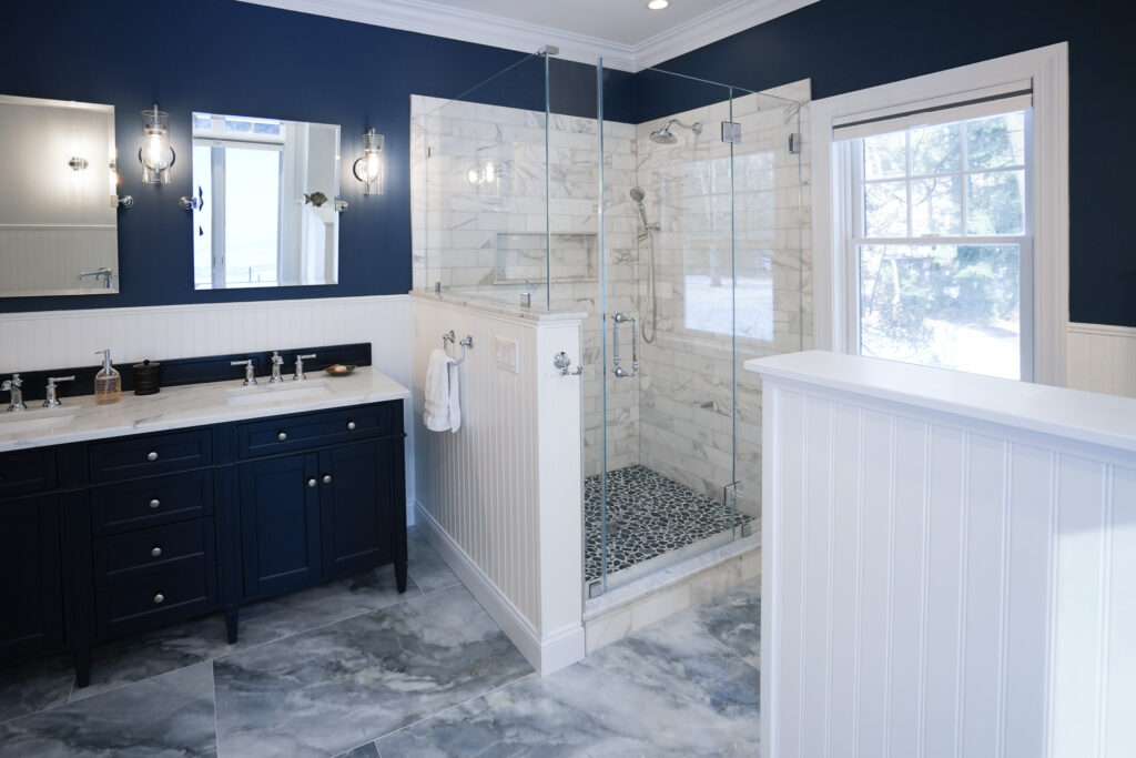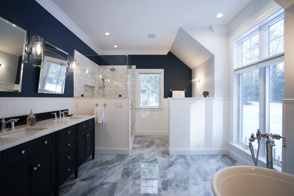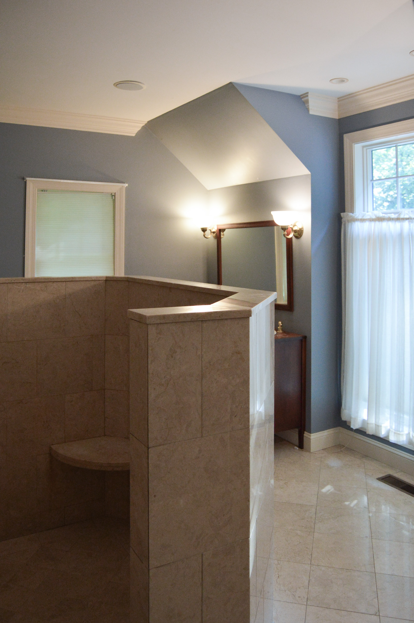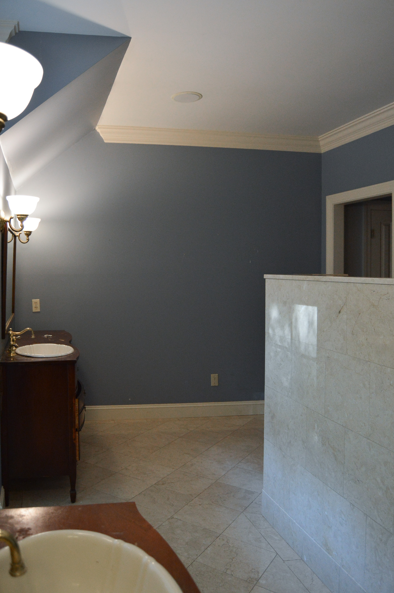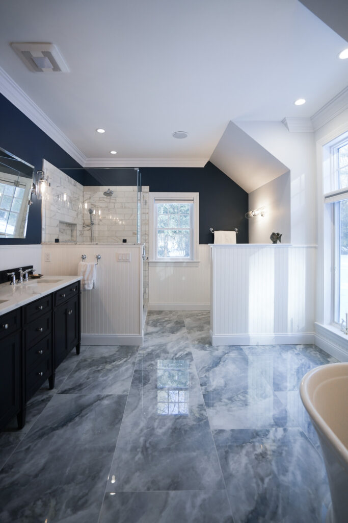 This master bathroom enjoys a large floor plan with high ceilings, and our client knew the space could be better utilized. We completely rearranged the layout of the room, changing the location of the vanity, shower and toilet, as well as adding a gorgeous free-standing soak tub.