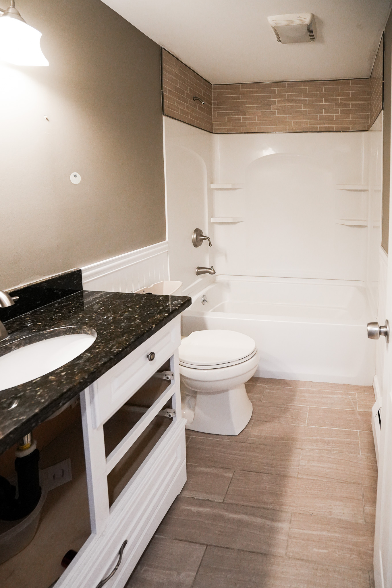 The fiberglass tub and shower are perfect for our client's growing family and will beautifully perform under wear and tear from kids and teens over the years. With beautiful selections of tile, vanity, lighting and a fresh coat of paint, this bathroom is not only now fully updated and a pleasure to use, it is stunning to look at, too!