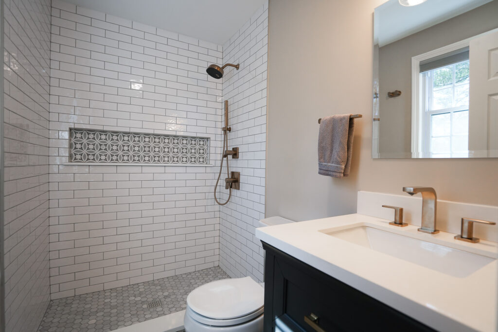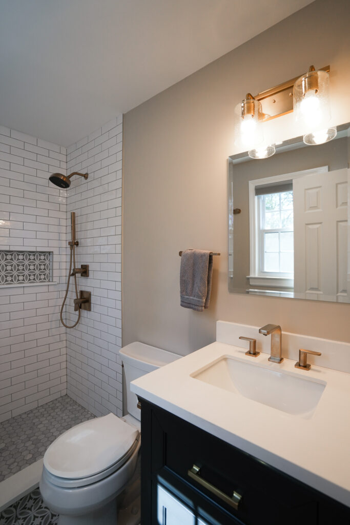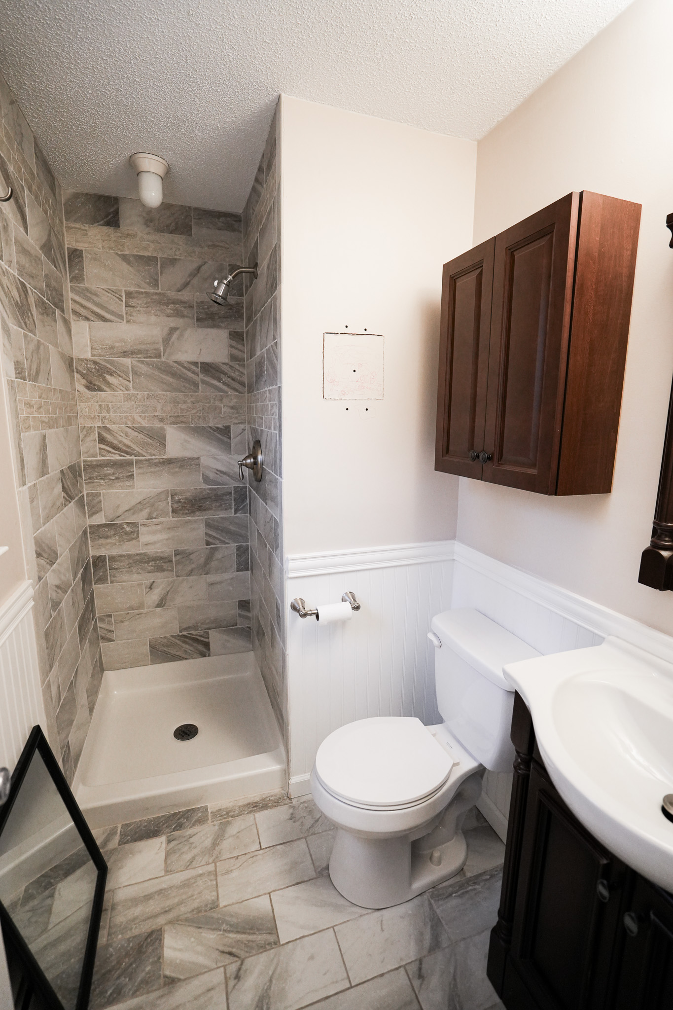 Upstairs was a common bathroom with outdated fixtures and styling. We completed a full demo in this bathroom down to the studs, building the new bathroom back piece by piece.