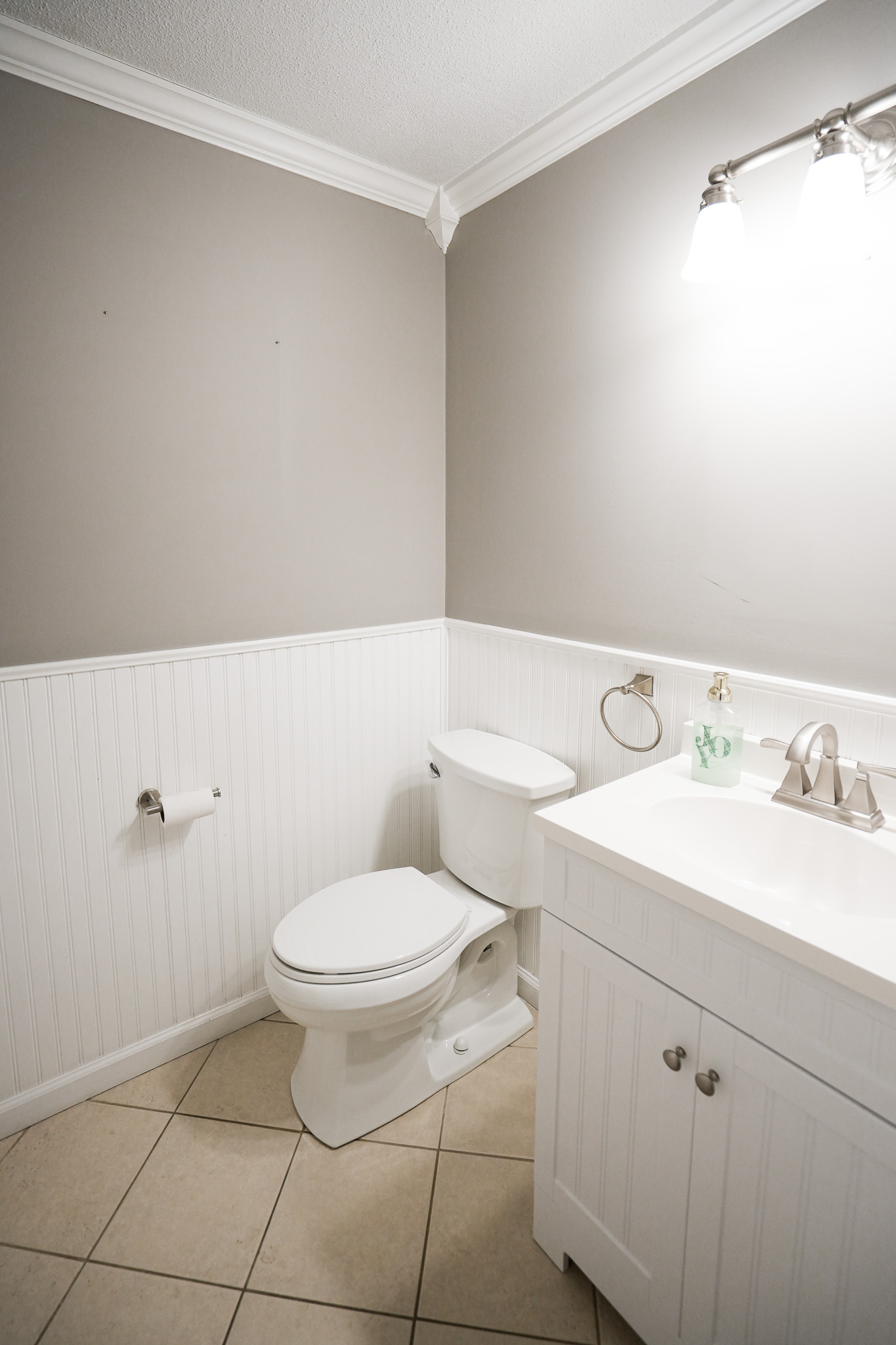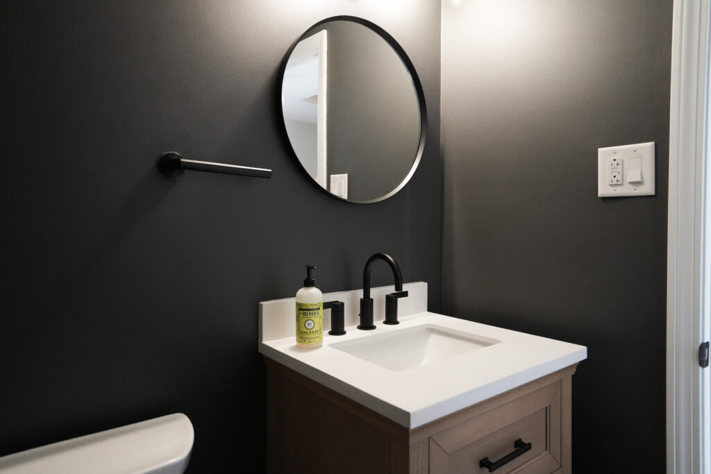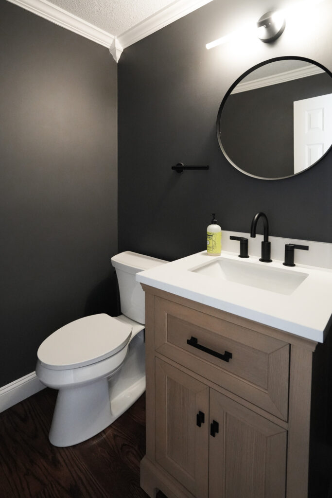 On the first floor there was a functional but uninspired powder room. Part of the full-home renovation project was to install hardwood flooring throughout the first and second floors of the home. We removed the tile here and continued the hardwood through this space which instantly elevated it. Look what new paint, styling and flooring can do for a bathroom!