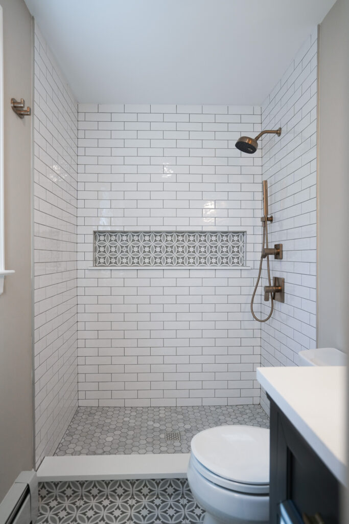 This space was a bit of an enigma; it had an irregular shape for no apparent reason. When we opened up the walls, we found that the prior builders bumped out the shower wall to accommodate a small shower pan and an inconvenient pipe. We were thrilled to be able to offer our client's a solution to this, restoring the room to it's proper size, reformattin the plumbing layout and giving our clients a much more comfortable showering experience and a more elegant bathroom design overall.